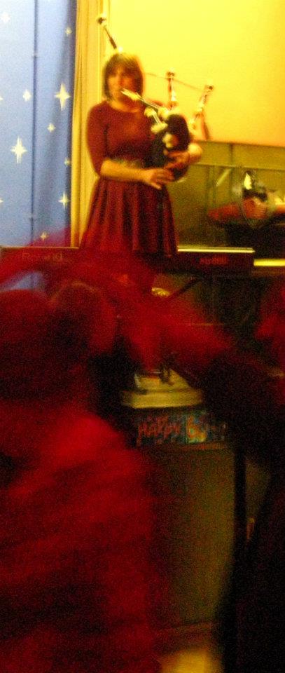 Liz on bagpipes at a summer ceilidh